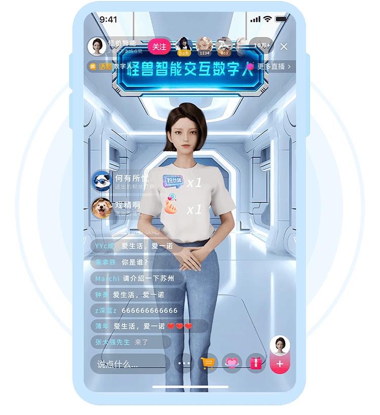怪兽AI数字人推出的[虚拟化身]是3D数字人应用工具,支持真人动捕驱动+智能脚本驱动的 方式,采用自研的视觉捕捉技术实时驱动数字人直播,同时支持AI智能问答、 姿态交互、动作交互等有趣玩法。